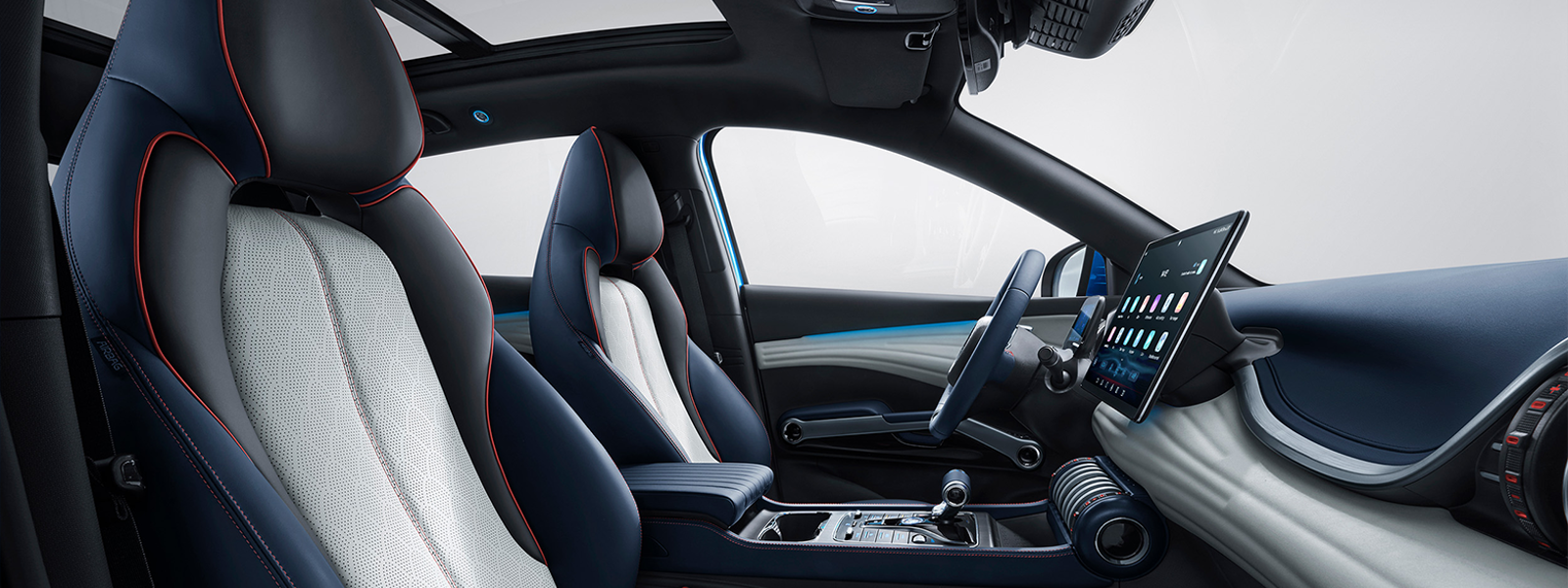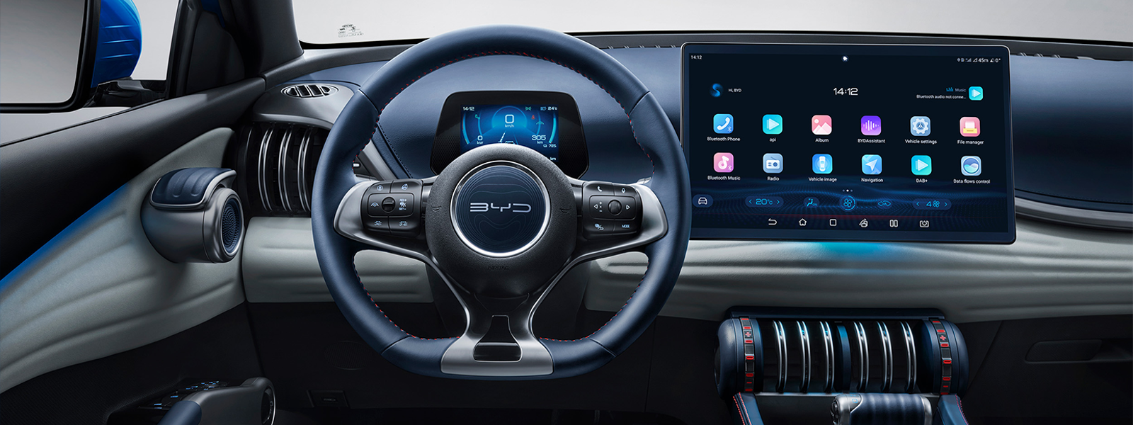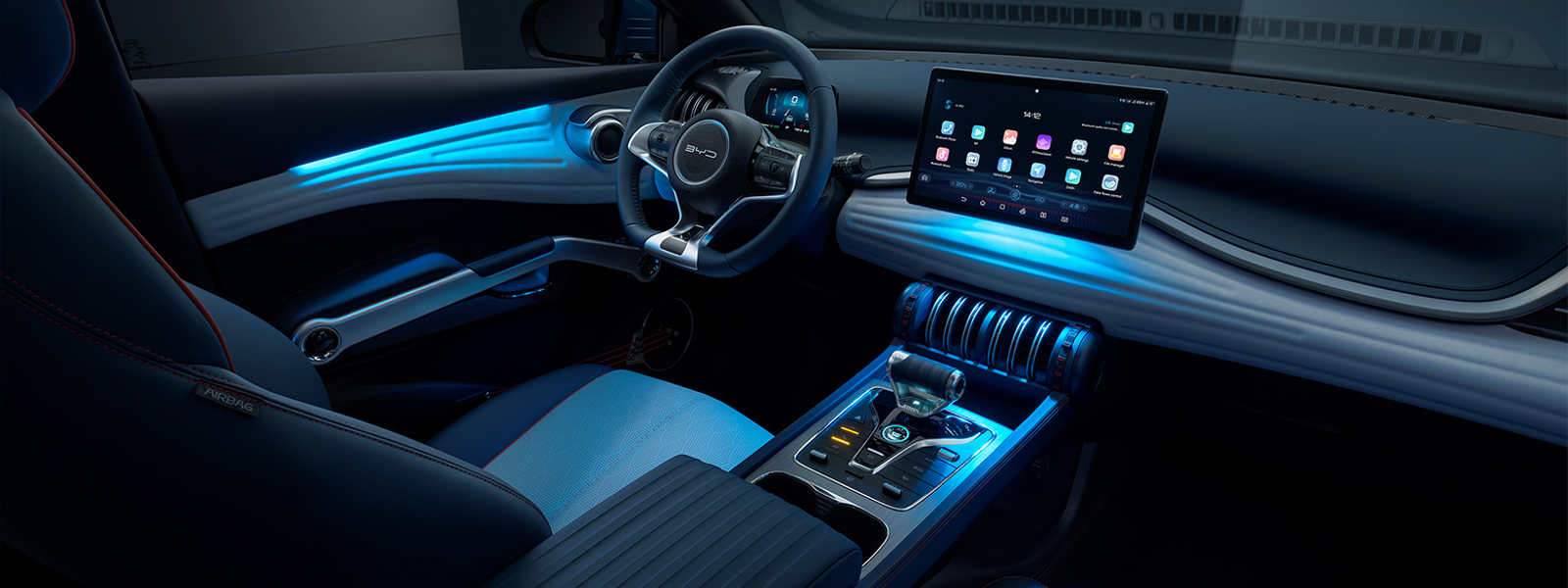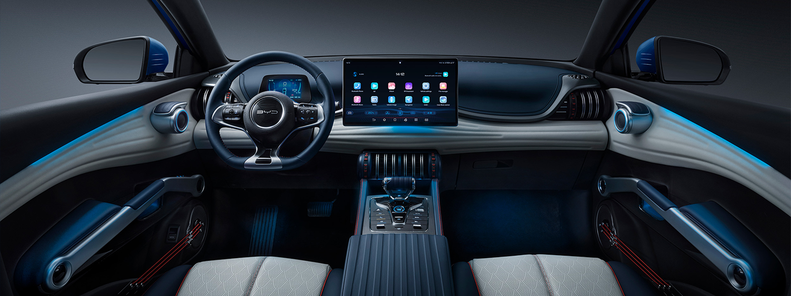 BYD ATTO 3 salona dizains izceļas ar unikāliem krāsu akcentiem un inovatīviem dizaina elementiem.